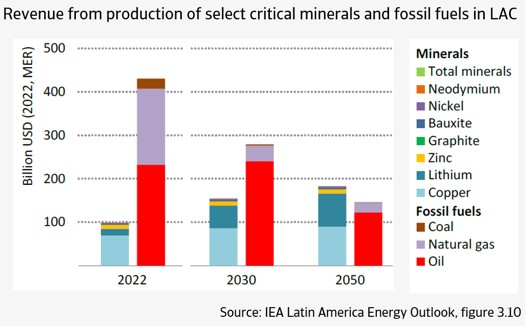 Remarkably, by 2050, the LAC revenue from critical minerals will overtake the combined revenue from the region’s – by that time much lower - fossil fuel production. It however remains to be seen whether the production of critical minerals offers a new earnings model for the region. The combined revenues from the production of the selected critical minerals and fossil fuels are estimated by the IEA at about USD 330 billion in 2050. This is significantly lower than the USD 520 billion earned in 2022.
