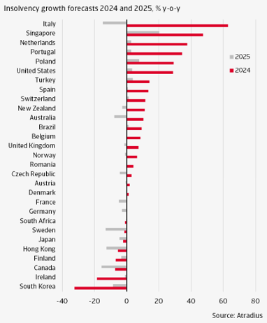 The highest insolvency growth rates in 2024 are recorded in Italy, Singapore, the Netherlands, Portugal, Poland and United States. For all of these countries insolvencies were at the start of 2024 still below the normality level, as already shown in figure 2. Thus, we expect high increases in insolvencies for these markets in 2024 such that the normalisation is achieved. Italy is an exception in this group as it is the only country where we did not observe any signs of normalisation, with the latest available data up to 2023Q3. We see however no reasons that the normalisation should not start from 2023Q4.